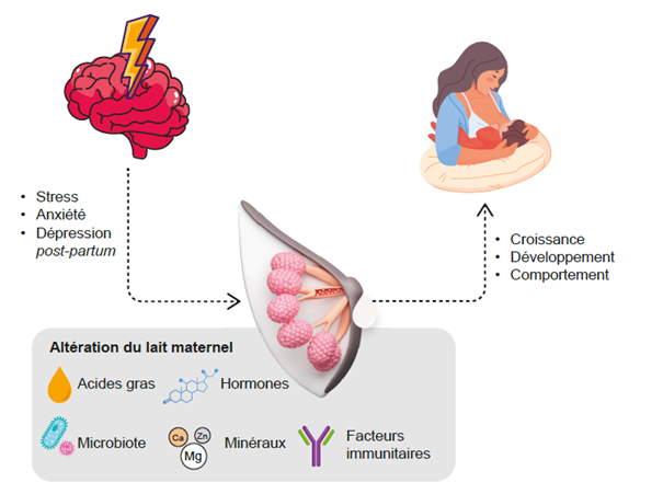 Figure 1 – La relation entre l’état mental de la mère et le développement de sa progéniture passent par le lait maternel.