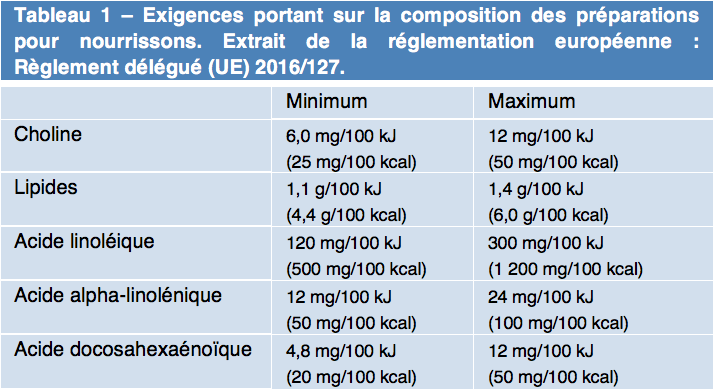 Les auteurs rappellent que dans la population américaine, les apports en DHA et choline sont inférieurs aux recommandations et que des populations à risque telles que les femmes enceintes ou allaitantes ont des besoins encore supérieurs. Les nourrissons allaités ont des apports en acides gras à très longues chaines et en choline via le lait de mère. Les préparations pour nourrissons doivent en contenir pour assurer une croissance et un développement normal de l’enfant. En Europe, la composition des préparations pour nourrisson est très encadrée. À partir de 2020, la législation imposera les modalités du Tableau 1 pour la choline et les acides gras polyinsaturés.