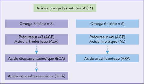 Principaux AGPI des séries omégas 3 et 6.