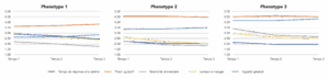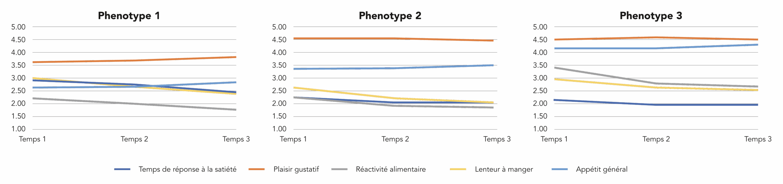 Enfin, le phénotype 3 (28 % des nourrissons) correspondait à des nourrissons avec l’ appétit global le plus élevé qui appréciaient la nourriture mais plutôt lents lors des repas et très réactifs à la nourriture. Là encore, ces paramètres diminuaient au temps 2 puis se stabilisaient.