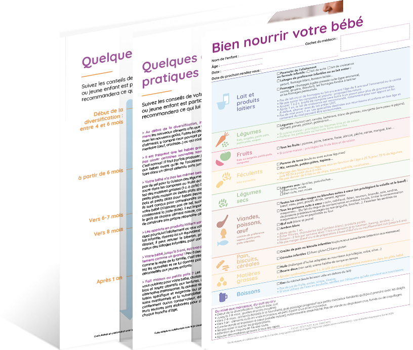 Cette fiche complètera la consultation en donnant des conseils pratiques aux parents pour faciliter la diversification alimentaire de leur bébé. Elle pourra leur fournir des repères sur les aliments et les quantités à introduire selon l’âge et les aidera à faire face aux difficultés souvent rencontrées, comme la gestion du goût.