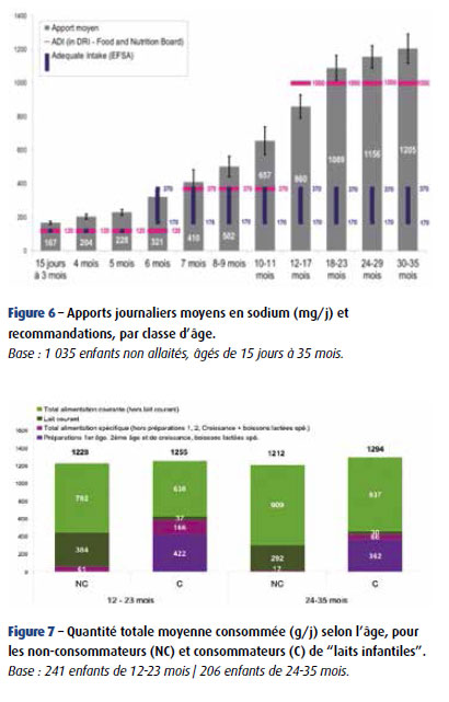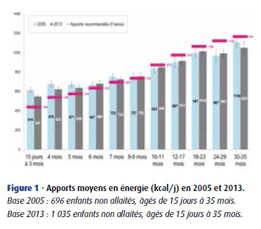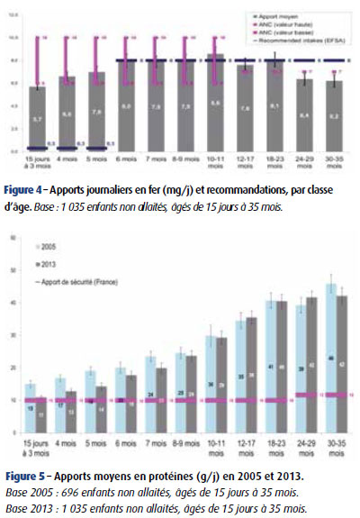 La composition et la quantité du lait maternel consommé étant variables, il n’est pas possible de définir avec exactitude les apports journaliers des enfants allaités ; l’analyse nutritionelle a donc été faite chez les enfants non allaités (permettant une comparaison avec les enquêtes précédentes n’ayant inclus que des enfants non allaités). L’étude a été réalisée à partir de carnets de consommation, des tables de composition des aliments courants et infantiles, et des recommandations françaises (ANSES) et européennes (EFSA).