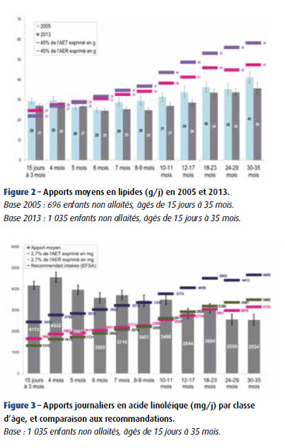 La tendance actuelle à la baisse de consommation des lipides se traduit aussi chez les tout-petits. Les apports en lipides ont significativement diminué entre 2005 et 2013, alors que leurs besoins sont 3 à 5 fois plus importants que ceux des adultes.