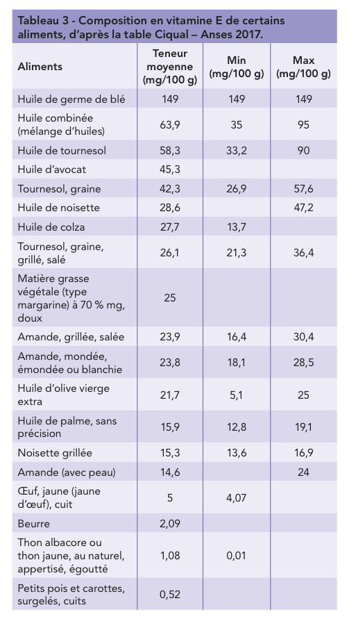 On trouve de la vitamine E dans les huiles végétales, le beurre, la margarine et les oléagineux de façon générale (olives, noix, amande, graines de colza…) (Tableau 3). Les fruits et légumes sont aussi une source importante de vitamine E. Il est conseillé de stocker les aliments riches en vitamine E à l’abri de la lumière, car elle se dégrade à la lumière. Les apports moyens chez l’adulte en France ont été estimés entre 15 et 18 mg/jour.