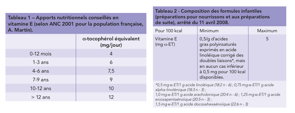 Les isomères de vitamine E sont absorbés par les cellules intestinales par diffusion passive puis sont transportés jusqu’à la lymphe puis le foie via les chylomicrons. Une fois arrivés au foie, l’a-tocophérol est pris en charge par l’a-TTP puis délivrée aux tissus périphériques après incorporation dans les VLDL, LDL et HDL (3). À la naissance, les stocks de vitamine E sont très bas et les besoins du nouveau-né sont importants. Ainsi, le lait de mère contient beaucoup de vitamine E. Une étude brésilienne a récemment dosé les teneurs en vitamine E dans le lait de cent mères allaitantes lors du premier mois de gestation après une naissance à terme (3). Le colostrum, produit avant le 3e jour suivant la naissance était particulièrement riche et contenait 40,5 ± 15,0 µmol/L alors que le lait de transition produit entre le 7e et le 15e jour contenait 13,9 ± 5,2 µmol/L et le lait de femme mature (après le 30e jour de lactation) 8,0 ± 3,8 µmol/L. Ces données montrent l’importance des besoins du bébé à la naissance, besoins qui diminuent ensuite après quelques semaines de vie. Les recommandations actuelles chez le nourrisson sont basées sur les concentrations moyennes en vitamine E du lait de mère produit durant les premiers mois de la lactation, les besoins alimentaires étant liés à la quantité d’acides gras polyinsaturés de l’alimentation (Tableau 1). Les préparations infantiles sont enrichies en vitamine E afin de répondre aux besoins des tout-petits (Tableau 2).