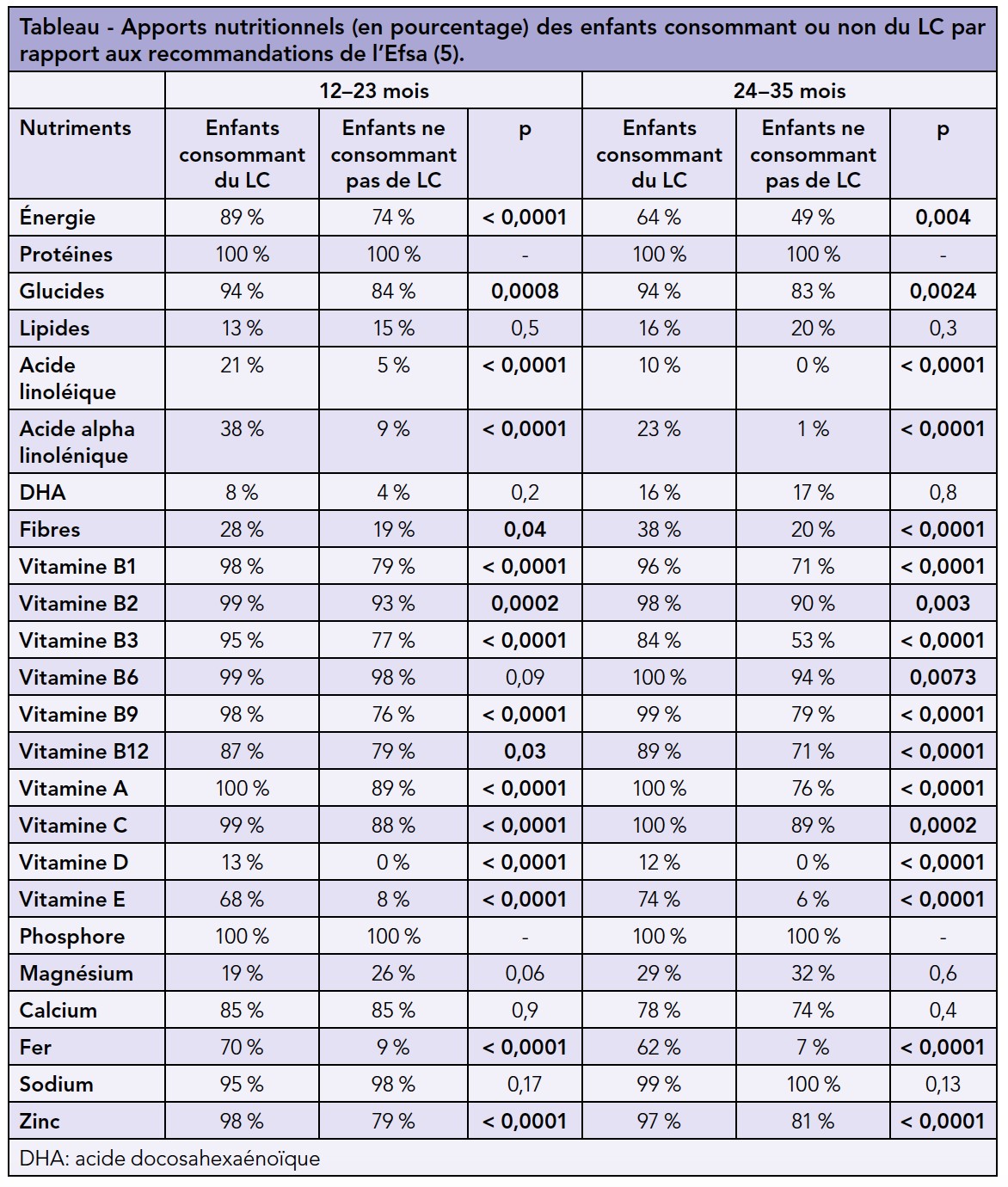 Cette conclusion est aussi relevée dans un article récent paru dans Nutrients (6). Les auteurs ont analysé de façon détaillée les enquêtes alimentaires réalisées dans le cadre de l’étude NutriBébé. Cette étude, conduite en 2013 avait inclus plus de 1 000 nourrissons non allaités pour lesquels des données nutritionnelles précises sur 3 jours avaient été recueillies. Dans cette cohorte, 241 nourrissons étaient âgés de 1-2 ans et 206 de 2-3 ans. Les auteurs ont comparé les apports nutritionnels et micro-nutritionnels des nourrissons consommant ou non du LC. Les différences d’apport entre les deux groupes étaient majeures, le groupe « consommateur de lait de croissance » étant beaucoup plus proche des apports recommandés pour l’âge (Tableau).