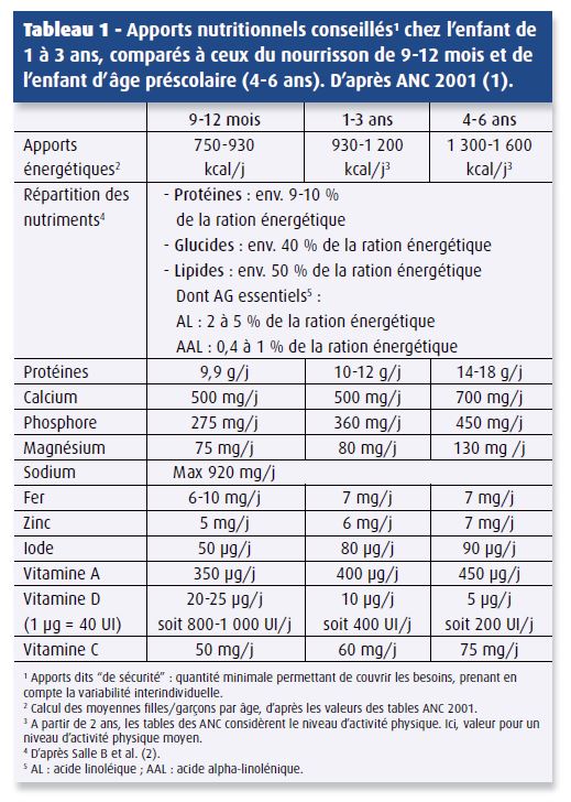 1.Beaufrere B et al. Nourrissons, enfant et adolescents. In : Apports nutritionnels conseilles pour la population francaise. Martin A et al. Editions Tec & Doc, 2001 : 255-91.