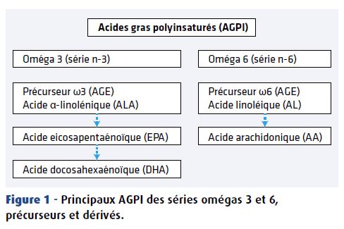 Les AGPI à longues chaînes précurseurs des séries ω 3 et ω 6, les DHA et AA, ne peuvent pas être synthétisés par l’organisme ; ce sont des acides gras dits essentiels (AGE). Leur apport doit donc être exogène, sous forme de ces précurseurs, mais aussi de leurs dérivés, la capacité de conversion des précurseurs chez les nouveau-nés et les jeunes nourrissons étant insuffisante pour couvrir leurs besoins (figure 1).