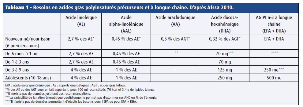 Les apports conseillés en acides gras essentiels, en pourcentage de l’apport énergétique, sont détaillés dans le tableau 1.