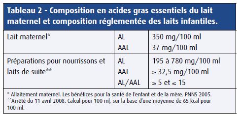 - Les acides gras polyinsaturés et les AGE sont présents dans le lait maternel et dans les préparations infantiles (selon la réglementation européenne) (tableau 2).