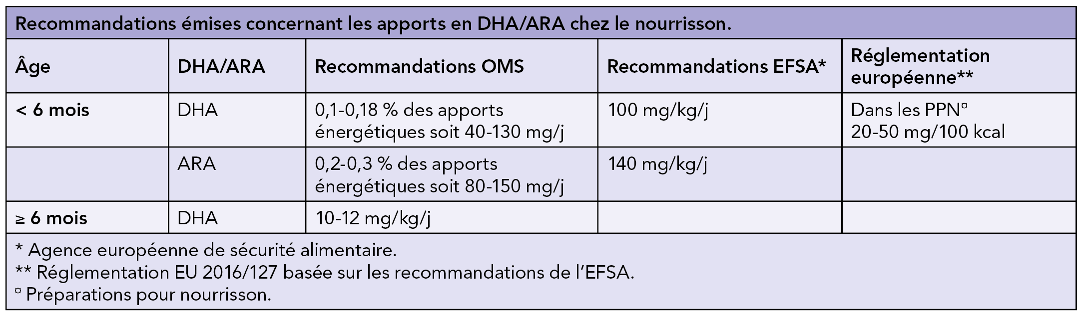 Lorsque l’allaitement maternel n’est pas possible ou non souhaité, il est nécessaire de nourrir un nourrisson avec une formule infantile ou préparation pour nourrisson (PPN). La composition de ces formules est très réglementée, afin d’être le plus proche possible des besoins nutritionnels des nourrissons, donc de la composition du lait maternel. Des apports nutritionnels adéquats sont en effet un prérequis pour une croissance et un développement optimal. Cependant, concernant les lipides, certaines interrogations persistent notamment concernant les apports en acide docosahexaénoïque (DHA) et acide arachidonique (ARA). Différentes instances ont défini des apports jugés optimaux pour les nourrissons (Tableau).