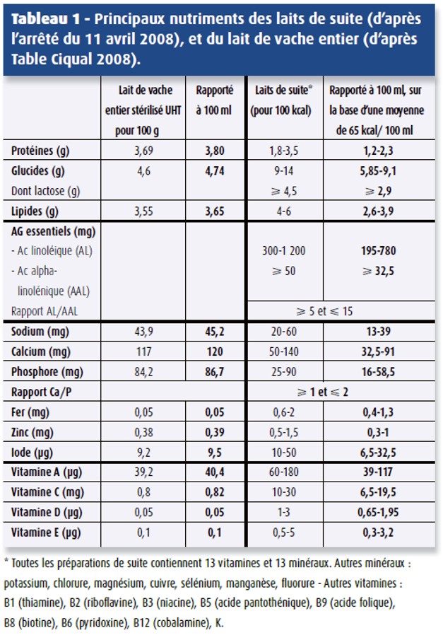 En relais de l’allaitement maternel ou du lait 1er âge, les préparations de suite (laits 2e âge) sont recommandées à partir de l’âge de 6 mois, et ce, jusqu’à l’âge de un an. Le lait de vache n’est pas conseillé avant l’âge de un an : il est trop riche en protéines et insuffisamment riche en acides gras essentiels, en certaines vitamines, fer et autres minéraux (pour les mêmes raisons, entre un an et jusqu’à 3 ans, le lait de croissance prendra le relais du lait 2e âge).
