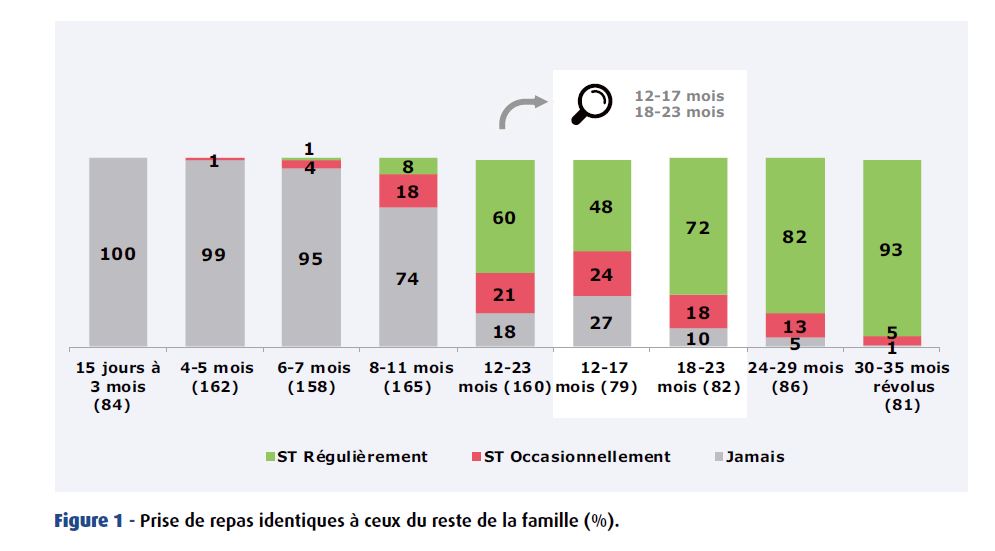- Pour les enfants de 1 an à 3 ans : 64 % mangent en même temps que leurs parents (74 % chez les mères multipares, et 65 % pour les primipares). Fait important, 60 % des enfants de 12 à 23 mois mangent régulièrement la même chose que la famille, c’està- dire des aliments non adaptés à leurs besoins et à leur physiologie (figure 1), alors que l’alimentation des trois premières années joue un rôle sur sa santé future et qu’une alimentation non adaptée peut avoir un impact direct, comme une surcharge rénale en cas d’apport protéique trop élevé ou de sel ajouté.