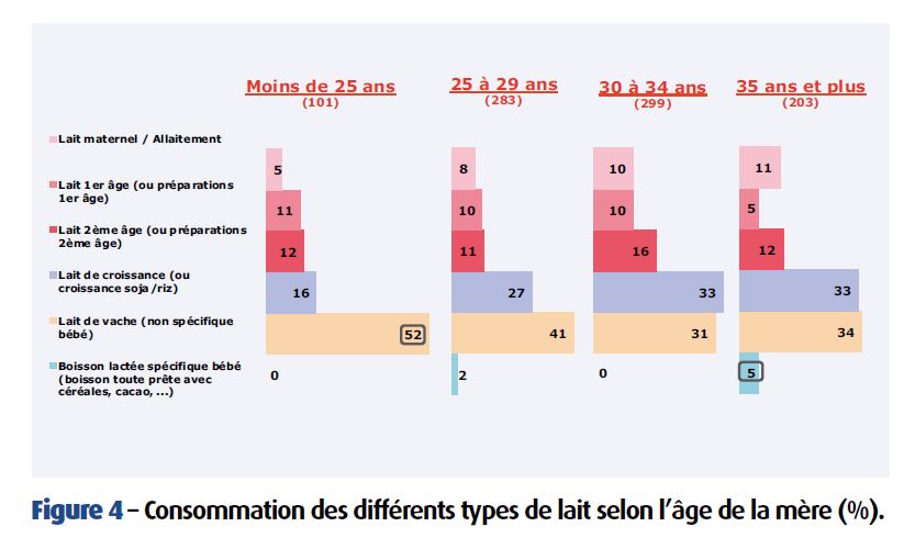 - Les résultats varient également entre les primipares et les multipares, avec une différence significative concernant le lait de croissance, davantage donné par les primipares (figure 3), ou encore l’âge de la mère qui montre que les plus jeunes donnent significativement plus de lait de vache (figure 4).
