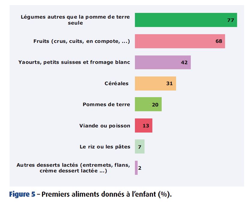 - Les premiers aliments donnés à l’enfant suivent dans la majorité des cas les recommandations, avec l’introduction des légumes et des fruits, mais d’autres aliments sont donnés dès le début de la diversification (figure 5).