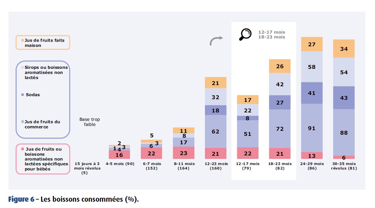 Si les boissons spécifiques pour bébé commencent à être consommées tôt (16 % à 4-5 mois, 22 % à 6-7 mois, puis dans cette même proportion pour les tranches d’âge suivantes, jusqu’à 23 mois), les sirops ou boissons aromatisées et jus de fruits du commerce, sources inutiles de sucre, le sont aussi. Fait notable : la consommation de sodas apparaît dès 12 mois !