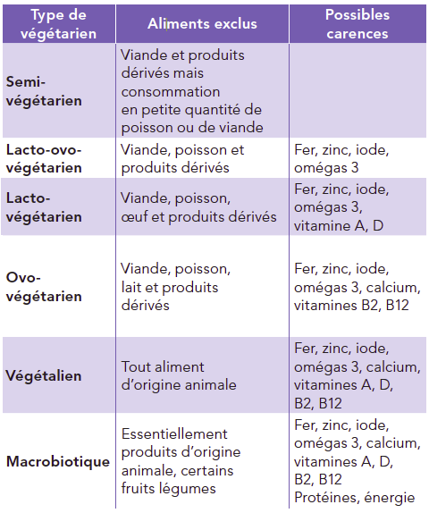 Plusieurs habitudes alimentaires dites « critiques » ont été identifiées. Les diètes végétariennes (5 à 6 % des enfants dans la population allemande) qui excluent les aliments d’origine animale sont souvent considérées comme plus « saines », car moins riche en acides gras saturés, sucres raffinés et sels et plus riches en fibres, antioxydants, etc. Cependant, le risque de carence en fer, iode et vitamine D semble plus élevé dans ces populations. De plus, des carences sévères (en vitamine B12, omégas 3, calcium, etc.) ont été rapportées chez des enfants avec des diètes très strictes, végétaliennes ou macrobiotiques.
