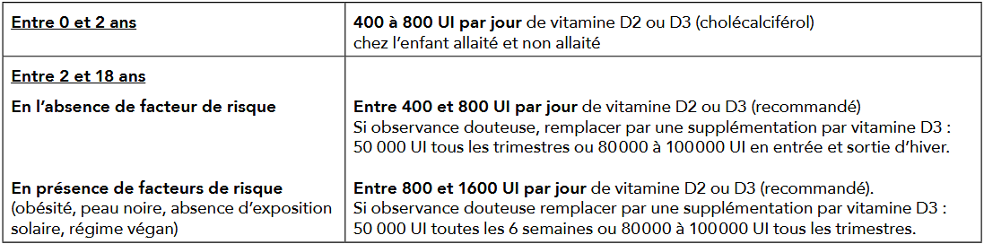 Les recommandations françaises de supplémentation en vitamine D ont été révisées en 2022, du fait d’une recrudescence de carence en vitamine D en France et plus largement dans le monde. Cette situation est liée aux modes de vie modernes (moins d’exposition au soleil) et touche tous les pays et tous les âges, avec un risque supérieur chez les enfants et les adolescents en raison de leurs besoins accrus en calcium pour leur croissance.