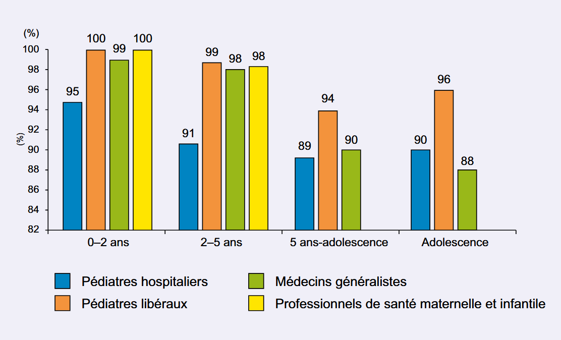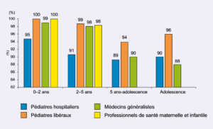 Au total, 966 médecins (87 % de pédiatres et 13 % de médecins généralistes) ont répondu à cette enquête. Quarante-sept pour cent avait une activité libérale.
